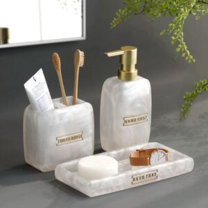 Material de Alta Calidad: Fabricado con resina de alta calidad, el Kit de Aseo Baño TrioBaño es resistente y duradero. Su construcción robusta asegura una larga vida útil, mientras que su acabado suave al tacto añade un elemento de lujo a tu rutina diaria de cuidado personal.